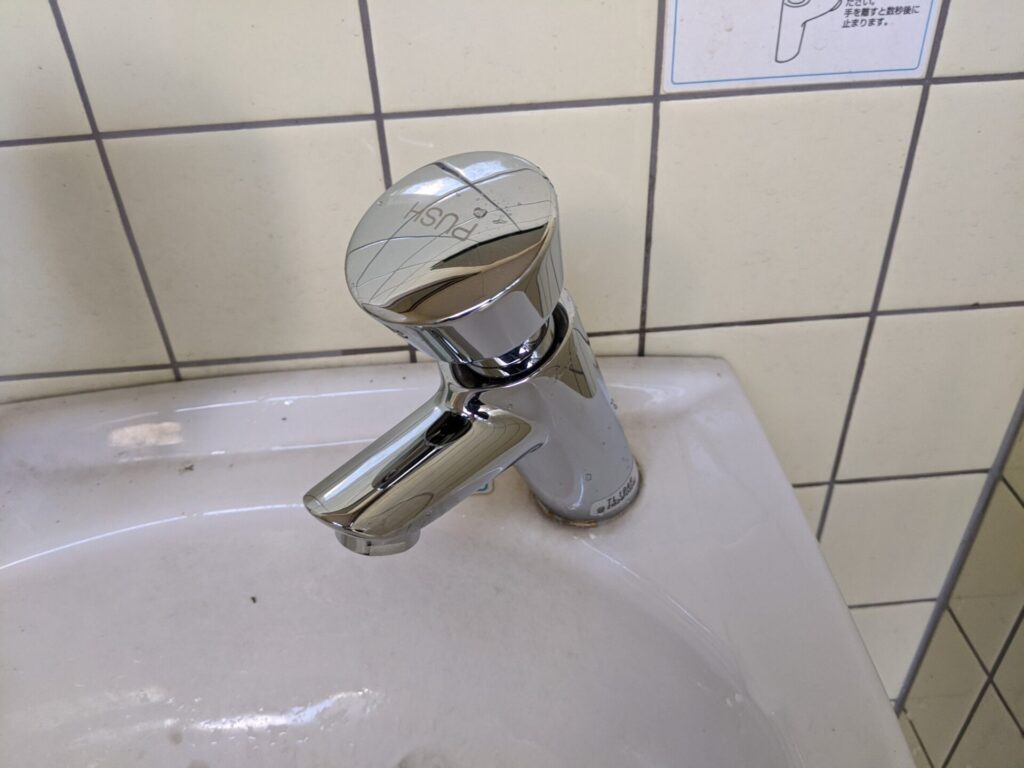 止まりが悪くなってしまったワンプッシュの自閉水栓を取り外し…。
